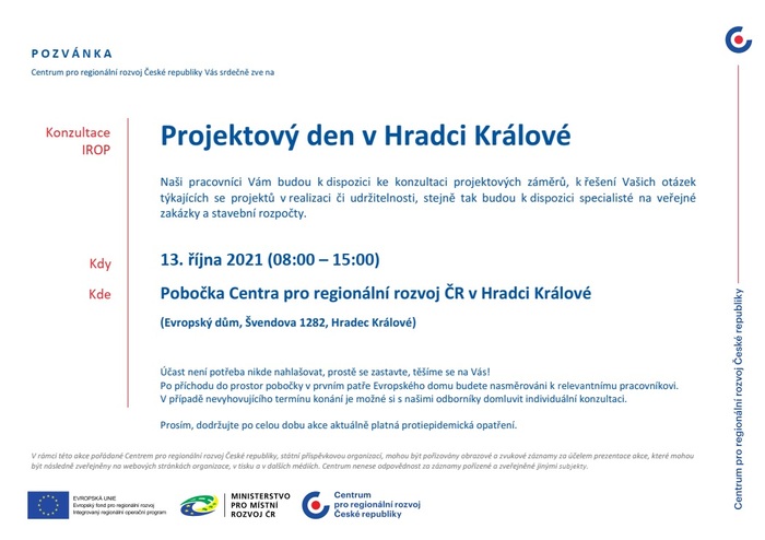 Pracovníci Centra pro regionální rozvoj vám budou k dispozici 13. 10. 2021 od 8:00 do 15:00 hodin ke konzultaci projektových záměrů, k řešení vašich otázek týkajících se projektů v realizaci či udržitelnosti, stejně tak budou k dispozici specialisté na veřejné zakázky a stavební rozpočty.