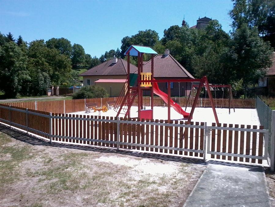 Výstupy projektu: oplocení plochy dětského hřiště, chodník, písková plocha hřiště, 4 ks laviček, 1 ks odpadkového koše, 4 ks herních prvků.