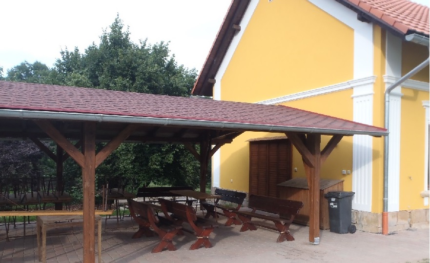 Výstupy z projektu: dřevěný přístřešek o rozměrech 8,1 m x 4,8 m, zámková dlažba.